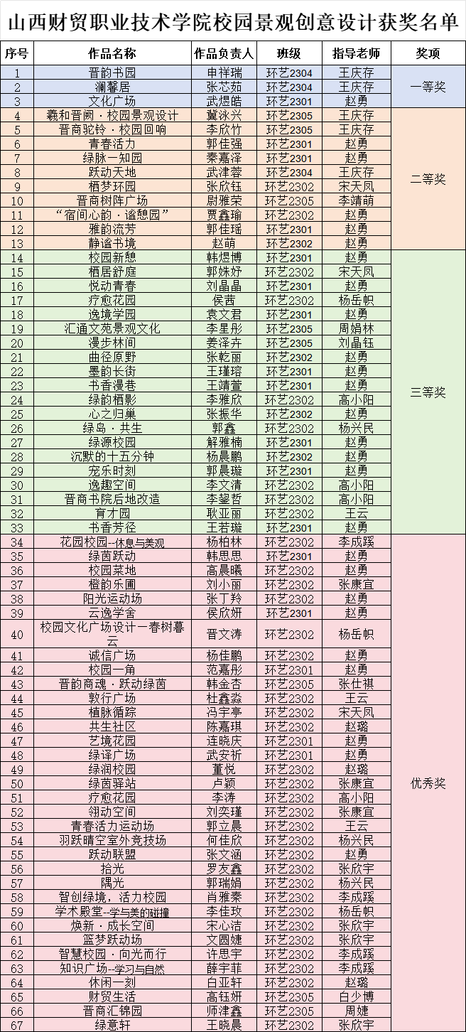 为深入挖掘晋商文化内涵,提升校园文化品位,营造浓厚文化育人氛围,我院于2025年2月至8月举办以“传承晋商文化培养新晋商人才”为主题的校园景观创意设计征集评选活动。近日,活动评选结果正式揭晓,67 件优秀作品从众多参赛作品中脱颖而出,分获一、二、三等奖及优秀奖。