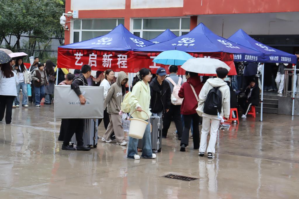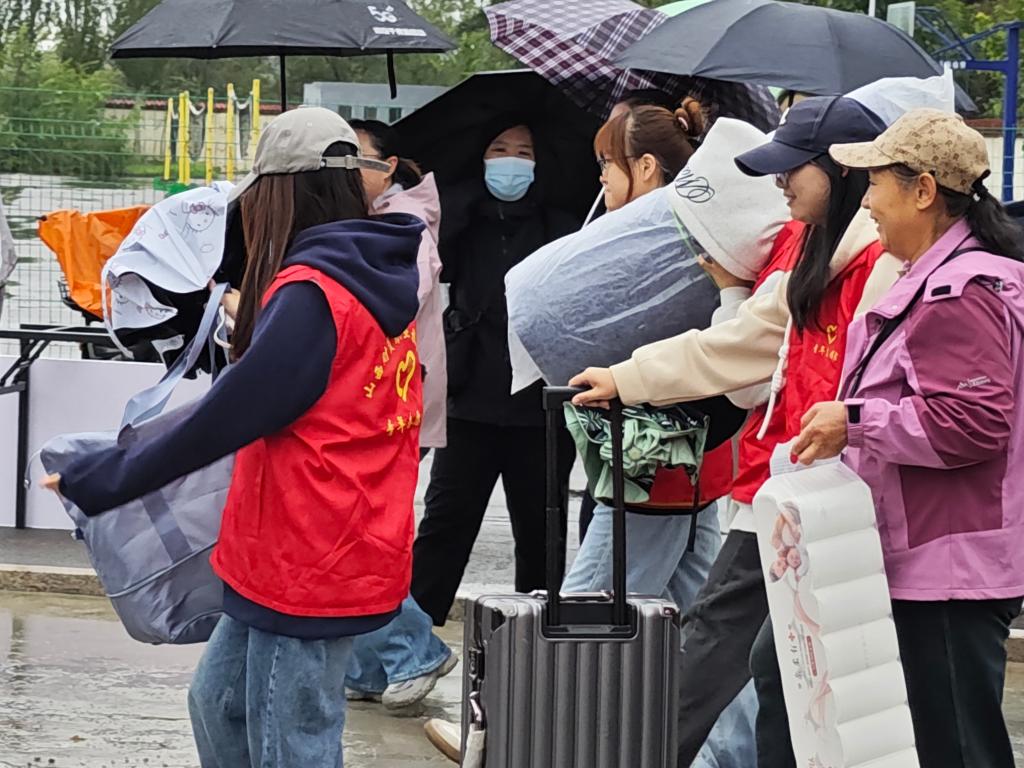 志愿护航,青春力量传递温暖。身着雨衣的志愿者穿梭在校园的每个角落,有的冒雨搬运行李,有的耐心指引答疑,有的协助办理一卡通、领取校服……他们用热情的笑容和周到的服务,让新生在秋雨中感受到财贸大家庭的温暖,也赢得了新生家长的频频点赞。