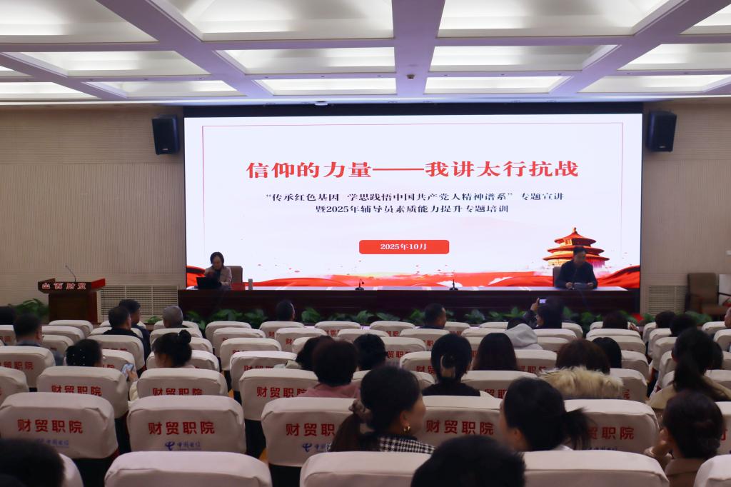 为推动党史学习教育常态化长效化,深入传承红色基因,引导广大师生坚定爱国奋斗、挺膺担当的理想信念,学院开展“传承红色基因 学思践悟中国共产党人精神谱系”专题宣讲暨2025年辅导员素质能力提升专题培训系列活动,10月20日下午,学院特邀八路军太行纪念馆第一代讲解员、首席讲解,北京师范大学、太原理工大学等20余所高校特聘客座教授崔韶光莅临校园,以《信仰的力量——我讲太行抗战》为题,为我院师生带来一场兼具思想深度与情感温度的专题讲座。