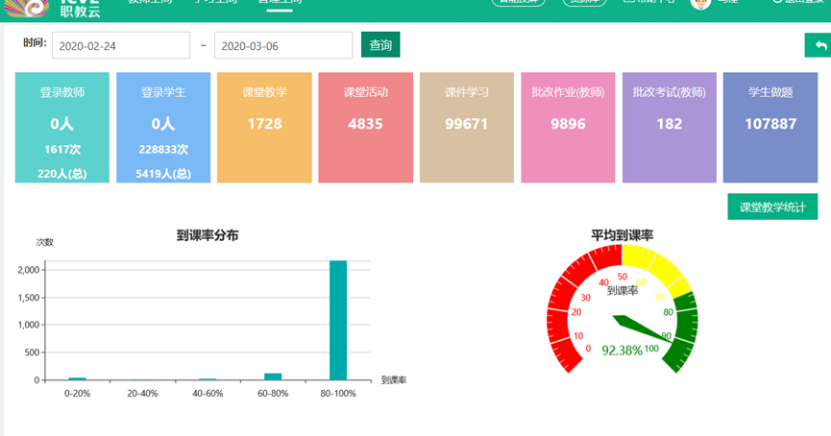 根据智慧职教平台数据统计:2月24日—3月6日,平台登录率方面,登录教师1617人次,日均162人次,日人均1人次;登录学生228833次,日均22883人次,日生均4人次,师生登录平台次数明显增加。课堂教学方面,课堂教学1728次,日均173次;课堂引入活动4835次,日均484次;课件学习99671次,日均9967次,课堂教学手段更加丰富多样。课后辅导方面,教师批改作业9896次,日均990次;组织考试并批改试卷182次,日均18次;学生做题107887次,日均10789次,日生均2次,课堂教学活动有效拓展至课后,提升了教学质量。学生到课率方面,学生平均到课率达到92.38%,学生学习积极性有所提高。