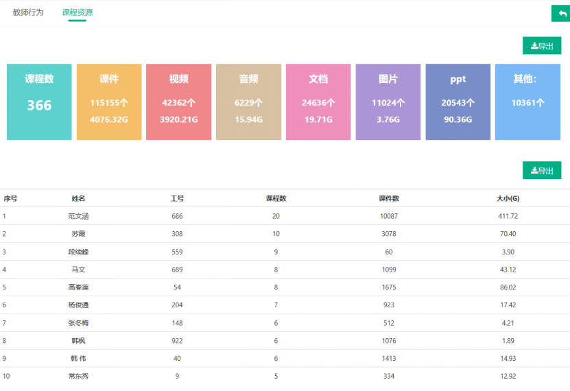 据统计,截止3月6日,在智慧职教云平台上,共建课程366门,课件数115155个、4076.32G,视频42362个、3920.21G,音频6229个、15.94G,文档24636个、19.71G,图片11024个、3.76G,PPT20543个、90.36G,其他资源10361个。在教师使用课程资源方面,处于前三位的分别为范文涵老师、苏霞老师及段续峰老师。课程资源种类多样,数量增多,提高了学生学习的主动性和积极性。