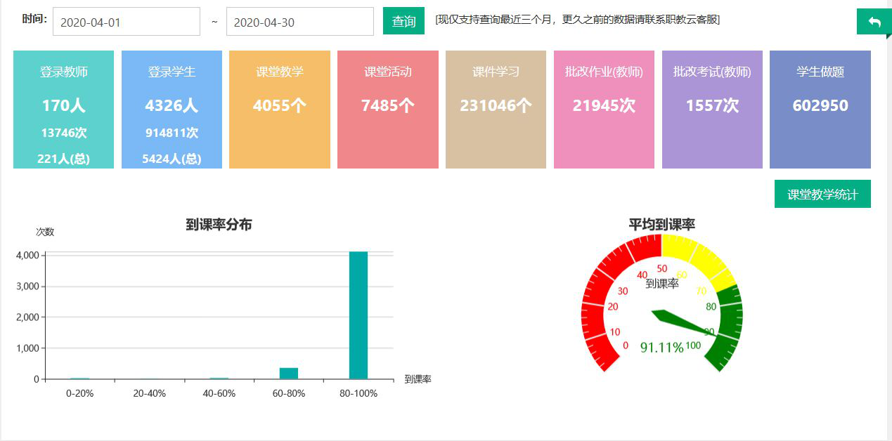 根据智慧职教平台数据统计:4月1日—4月30日,除去休息日,工作日合计22天。平台登录率方面,登录教师13746人次,教师人日均登录次数3.7人次,相较于前一阶段的日人均4.1人次,下降9.8%;登录学生914811次,日均登录次数9.6人次,相较于前一阶段的日生均10.3人次,下降6.8%。课堂教学方面,课堂教学4055个,日平均课堂教学数184.3个,相较于前一阶段的日均183.3个,增幅0.5%;课堂活动数7485个,日平均课堂活动数340.2个,相较于前一阶段的日均393.4个,下降13.5%;课件学习231046个,日平均课件学习数10502次,相较于前一阶段的日均8482.2次,增幅23.8%,学生自主学习积极性明显提高。课后辅导方面,教师批改作业21945次,日平均批改作业数997.5次,相较于前一阶段日均802.5次,增幅24.3%;教师批改考试1557次,日平均批改考试数70.8次,相较于前一阶段日均25.2次,增幅181%;学生做题602950次,日生均6.3次,相较于前一阶段的日生均5.5次,增幅14.5%。同前一阶段相比,在课堂教学环节方面,数据有所下降,但在学生自主学习及教师课后辅导方面,数据明显上升,表明线上教学已经从单纯关注课中,逐步扩展至课前和课后。