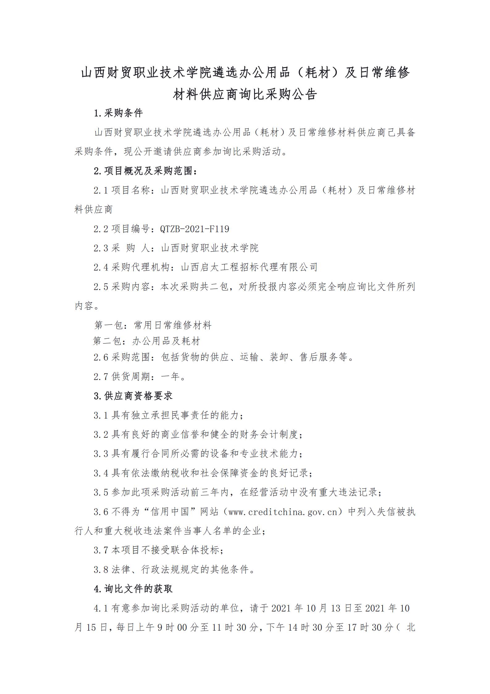 山西财贸职业技术学院遴选办公用品(耗材)及日常维修材料供应商询比采购公告