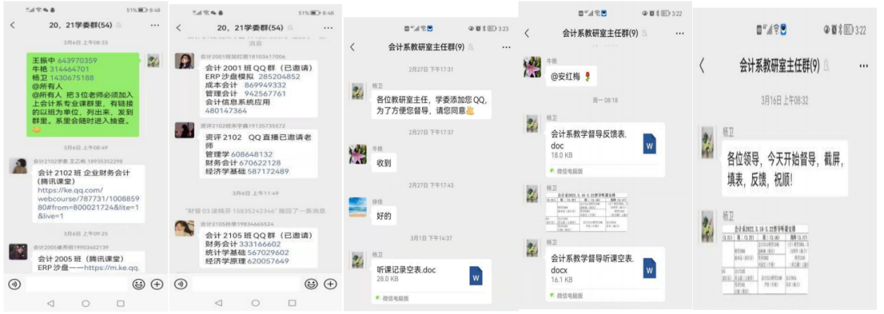 经济贸易系教师们充分利用了“职教云”+腾讯课堂、QQ分屏、微信群等方式完成线上教学,课堂上引导学生充分利用网络资源查找资料,参与讨论积极性极高,课堂气氛活跃,教学形式多样。督导过程中发现学生签到用时较长,且到课率有待提高等问题,下一步将针对发现问题,调动任课老师和班主任整改;同时,将重点听新教师、外聘老师,并将听课结果及时反馈,以帮助新老师、外聘教师尽快提升教学水平。