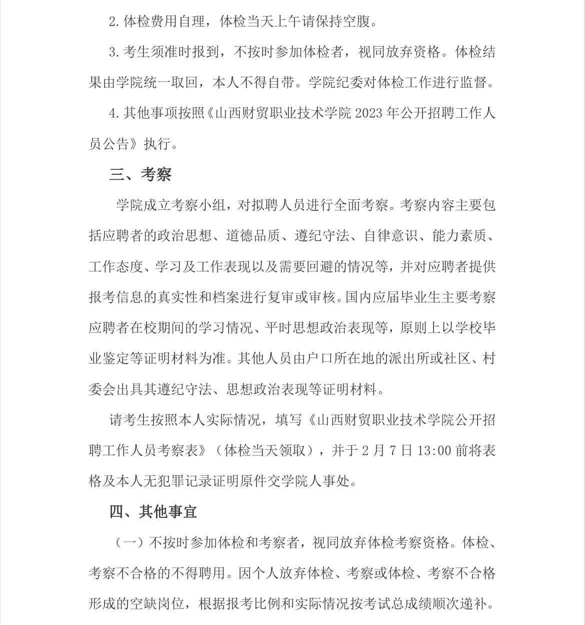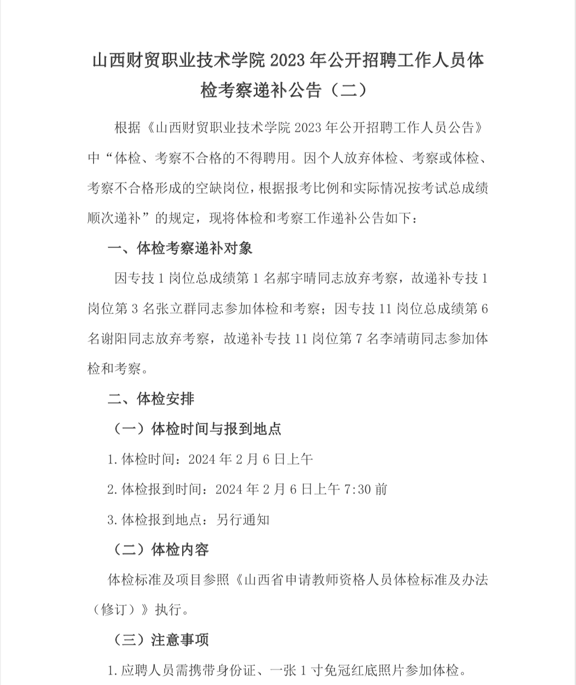山西财贸职业技术学院2023年公开招聘工作人员体检考察递补公告(二)