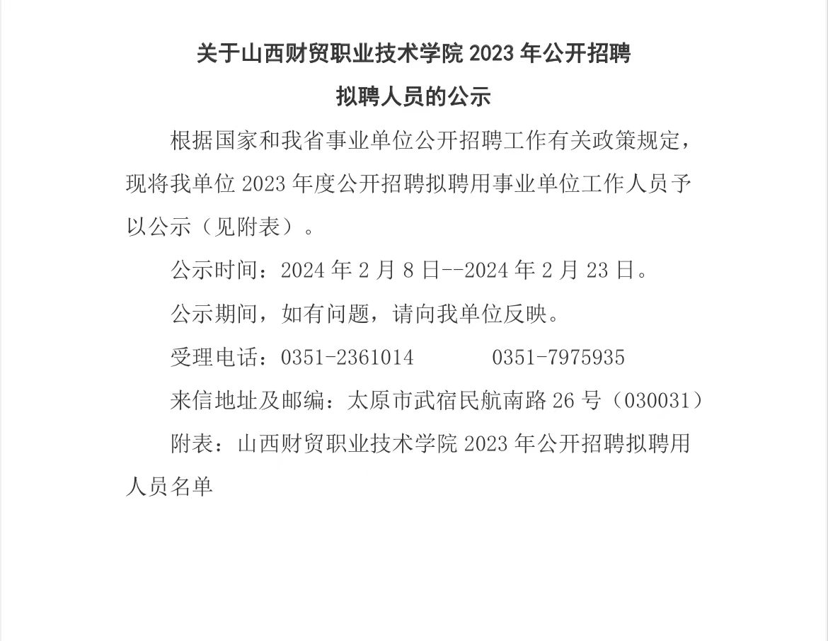 关于山西财贸职业技术学院2023年公开招聘拟聘人员的公示