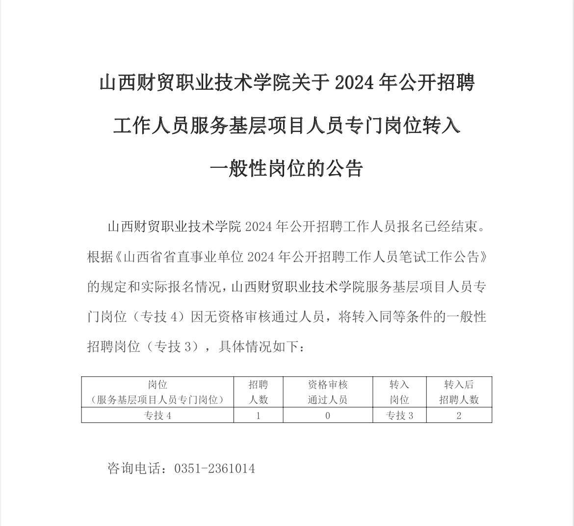 山西财贸职业技术学院关于2024年公开招聘工作人员服务基层项目人员专门岗位转入一般性岗位的公告