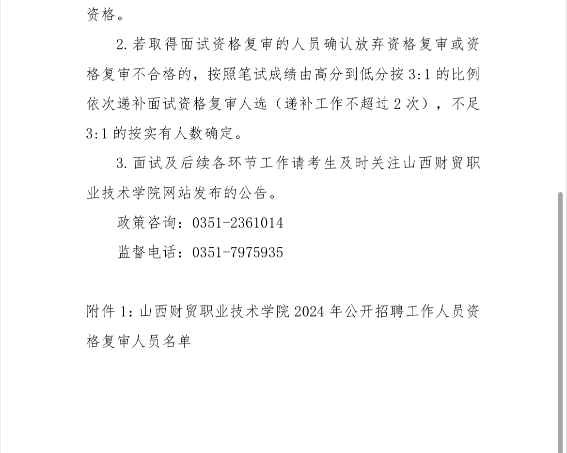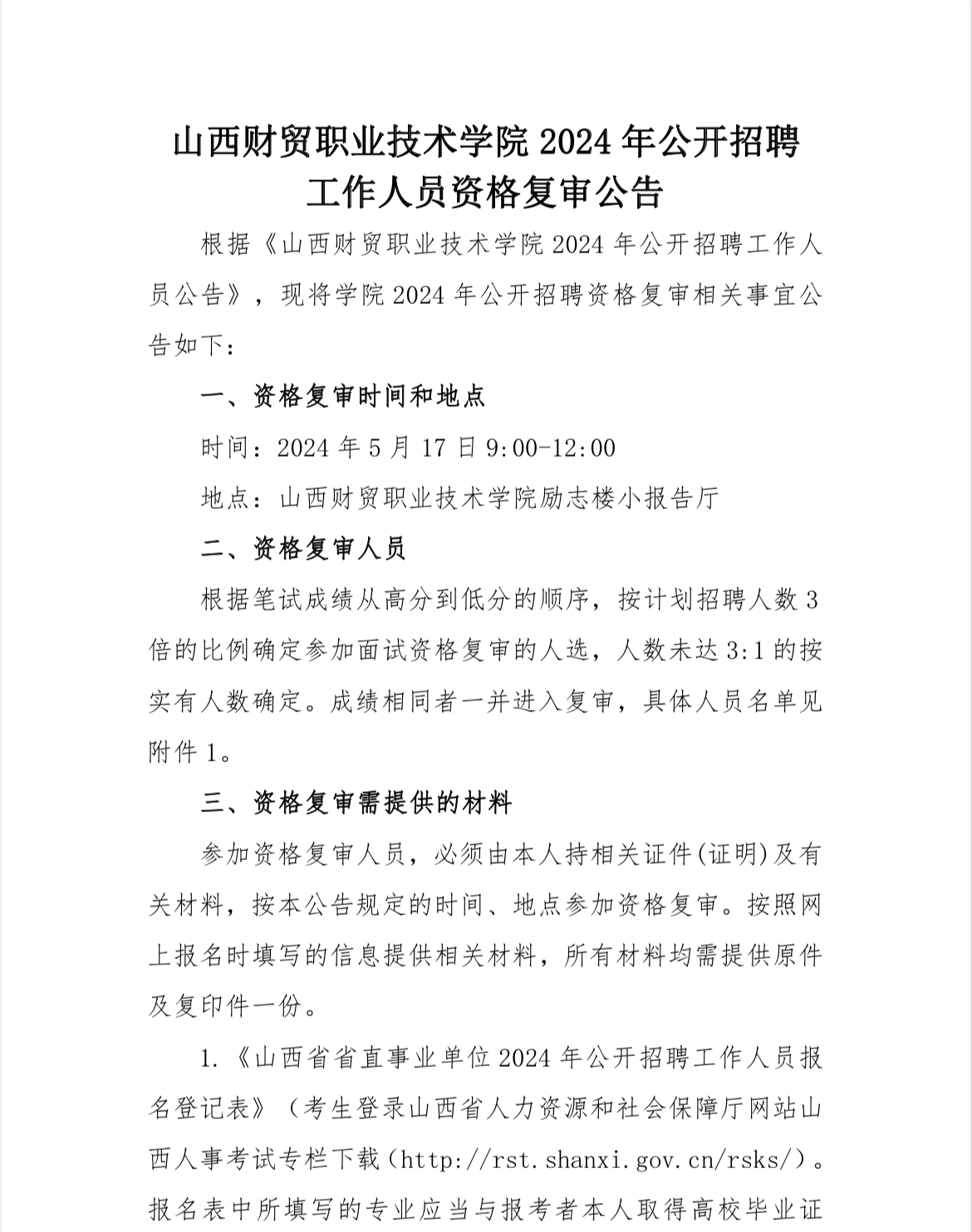 山西财贸职业技术学院2024年公开招聘工作人员资格复审公告