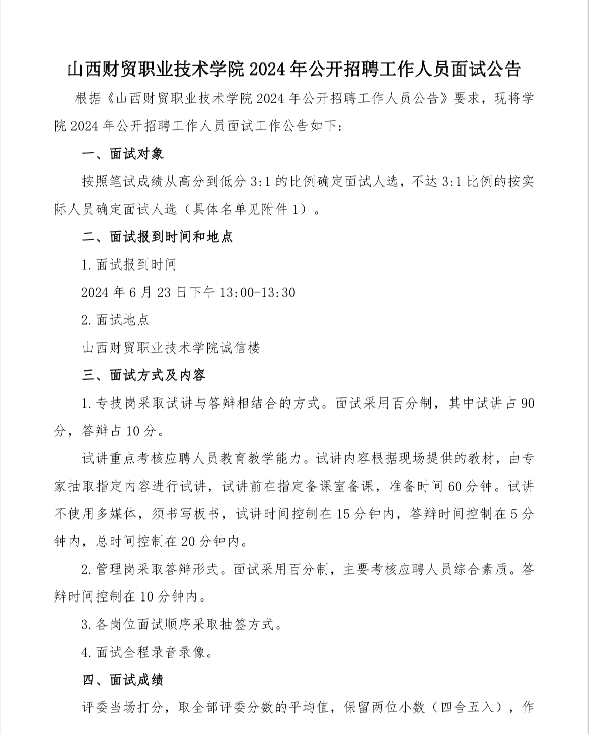 山西财贸职业技术学院2024年公开招聘工作人员面试公告