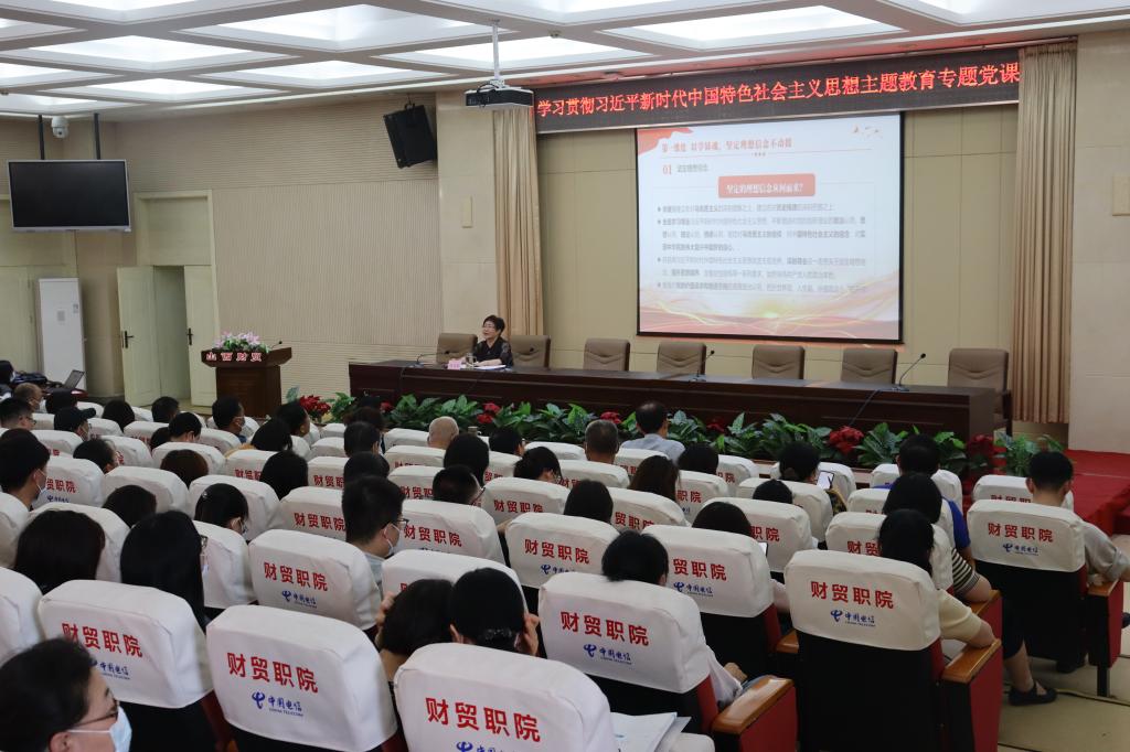 院长段文美同志紧紧围绕“学思想、强党性、重实践、建新功”的主题教育总要求,结合学院工作实际及个人学习思考所得,从以学铸魂坚定理想信念不动摇、以学增智深刻感悟思想伟力、以学正风作风建设永远在路上、以学促干办好人民满意的教育四个维度,系统梳理了习近平总书记的重要论述、指示批示精神并分享了学习心得。宣讲中,她首先以筑牢思想之基、补足精神之钙、把稳思想之舵为切入点,带领与会人员共同学习领会了习近平总书记关于坚定理想信念的重要论述,强调通过读原著、学原文、悟原理实现以学铸魂。其次,结合学院实际深入阐述并鼓励学院广大师生遵循“六个必须坚持”的科学方法论,汲取思想伟力,更加深刻的领会党的创新理论的道理学理哲理,从而不断提高推动职业教育高质量发展、服务师生和防范化解风险的本领,加强斗争精神和斗争本领养成。再次,从为什么、是什么、怎么办的逻辑理路,带领广大师生深刻理解和感悟习近平总书记关于“作风建设永远在路上”的重要论述,深刻认识党的自我革命的重大意义并要求党员干部自觉加强党性修养、自觉践行以人民为中心的发展思想、坚持真抓实干和埋头苦干,当好建设良好政治生态和社会风气的引领者、营造者、维护者。最后,聚焦办好人民满意教育目标,面向特色鲜明、省内一流、全国知名高职院校建设目标,勉励学院上下既谋时也谋事;既主动也作为;既输出也输入;既能干事又能共事;既做好“经师”,又成为“人师”,坚持不懈用习近平新时代中国特色社会主义思想凝心铸魂,牢记“国之大者”,为构建适应技能山西建设高质量发展的现代职业教育体系,培养更多应用型技能型人才贡献力量与智慧。