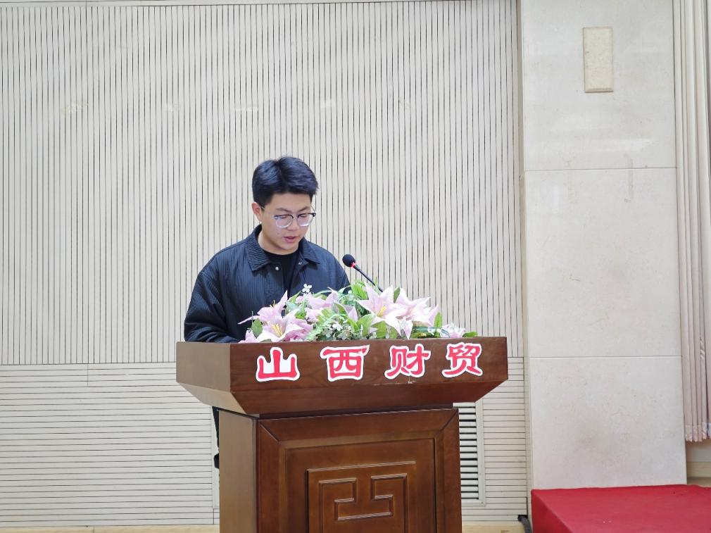 第十六届院学生会执行主席申鑫缘代表全体学生会工作人员发言,对学生会过去一年中在思想引领、组织建设、青春聚力、校园活动四个方面的工作成果进行总结。他表示在本学期,学生会以加强大学生思想政治教育工作为主线,以丰富校园文化活动为依托,以提高青年学生综合实践能力为目标,以服务青年学生、维护合法权益为重点,以强化自身组织建设为保障,努力营造和谐、进取与创新的校园文化氛围,为广大青年学子构建更好的发展环境与发展平台,并希望新一届的学生会成员不断提高自身综合素质,切实履行好各部门的工作职责,坚定理想信念,练就过硬本领。