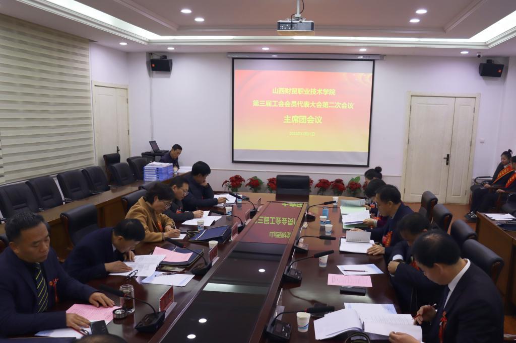 大会主席团召开会议,认真听取各代表团的汇报,讨论通过《山西财贸职业技术学院工作报告》(草案)等六个报告,《山西财贸职业技术学院工作报告的决议》(草案)等六项决议。