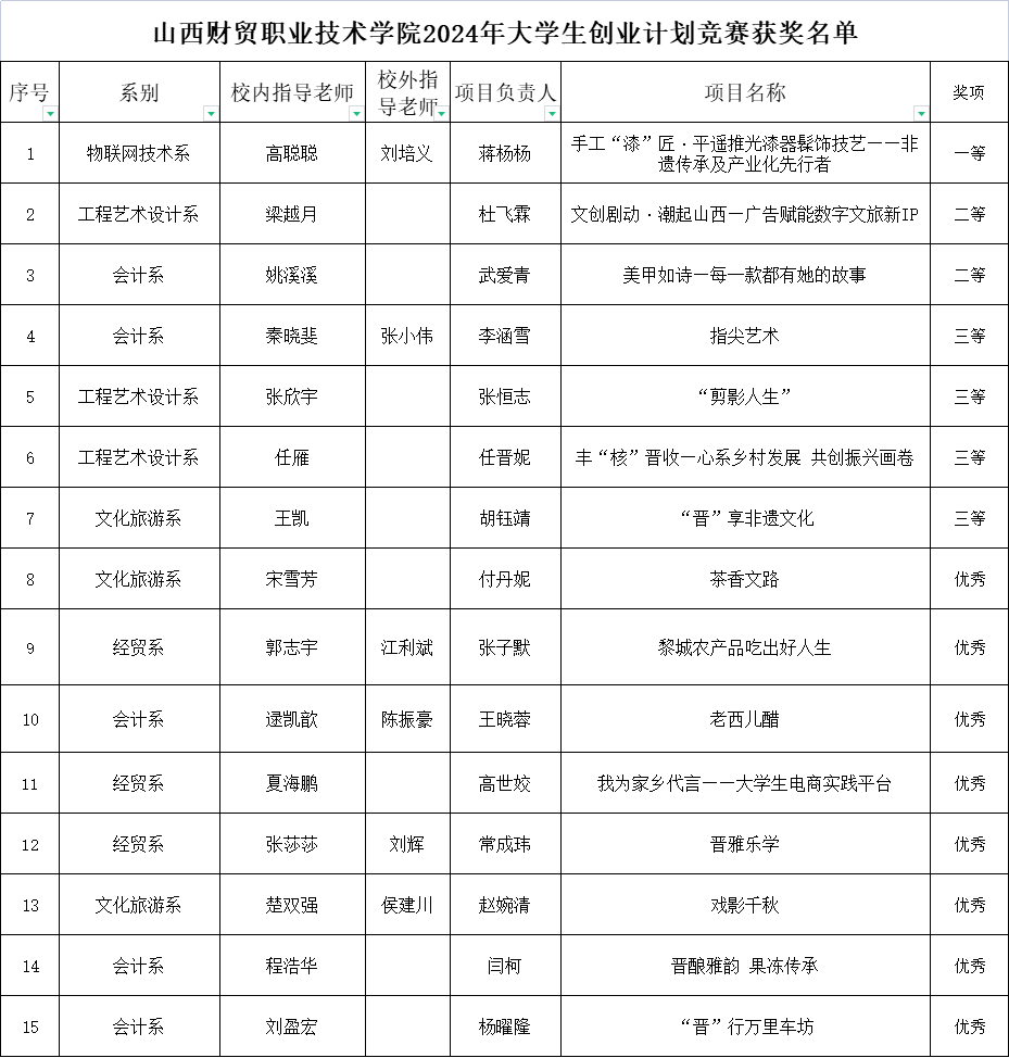 为深入学习贯彻党的二十大精神,落实《国务院办公厅关于进一步支持大学生创新创业的指导意见》,深化学院教育综合改革,推动双创赛事成果转化和产学研用紧密结合,切实提高学生的创新精神、创业意识和创新创业能力,努力形成更高质量的创新创业新局面。我院于2024年4月29日在砺志楼大报告厅举办了山西财贸技术学院2024年大学生创业计划竞赛。