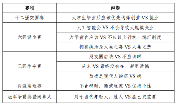 本次“创新杯”辩论赛秉持“激情碰撞,跌宕成长”理念,遵循国际辩论赛规则及流程,共分为自我介绍、陈词立论、驳立论、质辩环节、自由辩论、总结陈词六个环节,涵盖班级选拔赛、十二强突围赛、六强诞生赛、三强争夺赛、两强角逐赛、冠军争霸赛暨闭幕式六项赛程,辩题聚焦社会热点话题、校园环境管理、学生宿舍管理、心理健康教育、人际关系处理等方面。