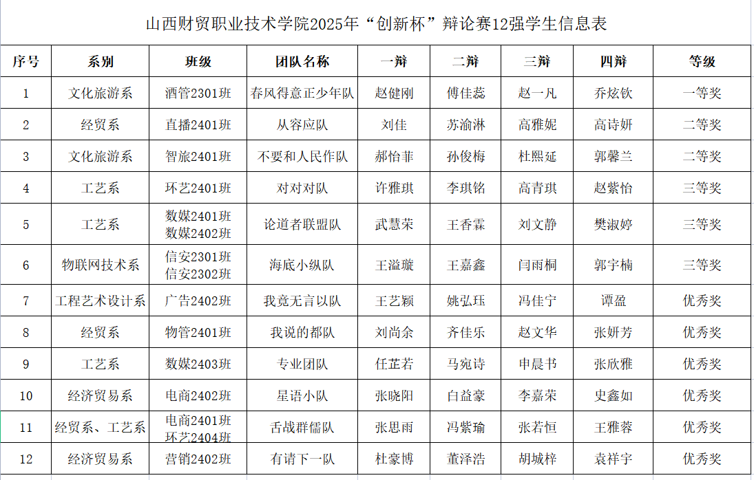 为创新课程实践形式,提升我院学生的思辨能力和创造能力,充分展现当代大学生面向未来、开拓创新的精神面貌,学生处依托《创新创业基础训练》课程,于2025年4月14日-5月21日在“一站式”学生社区服务中心举办了山西财贸职业技术学院2025年“创新杯”辩论赛。
