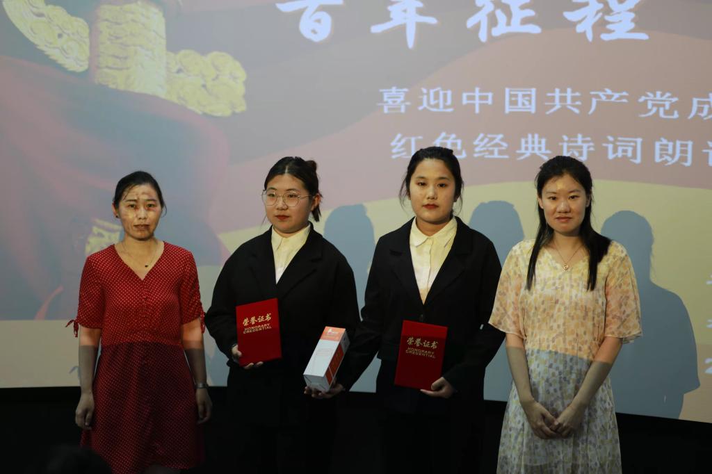 比赛中,选手们紧扣主题进行配乐朗诵,大家精神饱满、准备充分,用嘹亮的声音激情诵读,通过《党旗下,我举起右手》、《永远跟党走》、《百年党史诵读》、《盛世中国》等十一首赞歌,带领观众回到了那段峥嵘岁月,展现了百年党史独特的辉煌壮阔,让大家深切地感受到党这100年的历史,是无数共产党人不畏艰难困苦,甘于奉献牺牲,用生命、汗水、智慧浇灌出的壮丽史诗。经过一个多小时的激烈角逐,通过评委现场评分,最终,李馨怡、王荣两位同学以大气磅礴且富有感染力的朗诵赢得了本次比赛一等奖。比赛最后,评委们为获奖选手颁发了证书和奖品。
