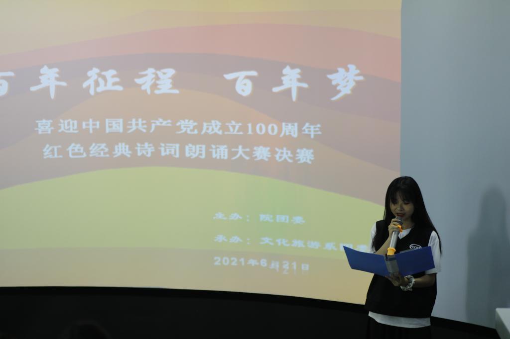 为深入学习贯彻习近平新时代中国特色社会主义思想,庆祝中国共产党成立100周年,推动青年大学生深入学好党史、新中国史、改革开放史、社会主义发展史,引导广大学子坚定理想信念,厚植爱国情怀,发奋成长成才,由院团委主办、文化旅游系团委承办的第二十届校园文化艺术节“百年征程,百年梦”喜迎中国共产党成立100周年红色经典诗词朗诵大赛于2021年6月21日中午12:50在东阶梯顺利开展。担任本次比赛的评委有院团委赵晓阳老师、经贸系团委书记秦晓、物联网技术系辅导员李艳芳、工程艺术系团委书记梁越月、文化旅游系党总支副书记张鹤。各系共120余名同学观看了此次比赛。