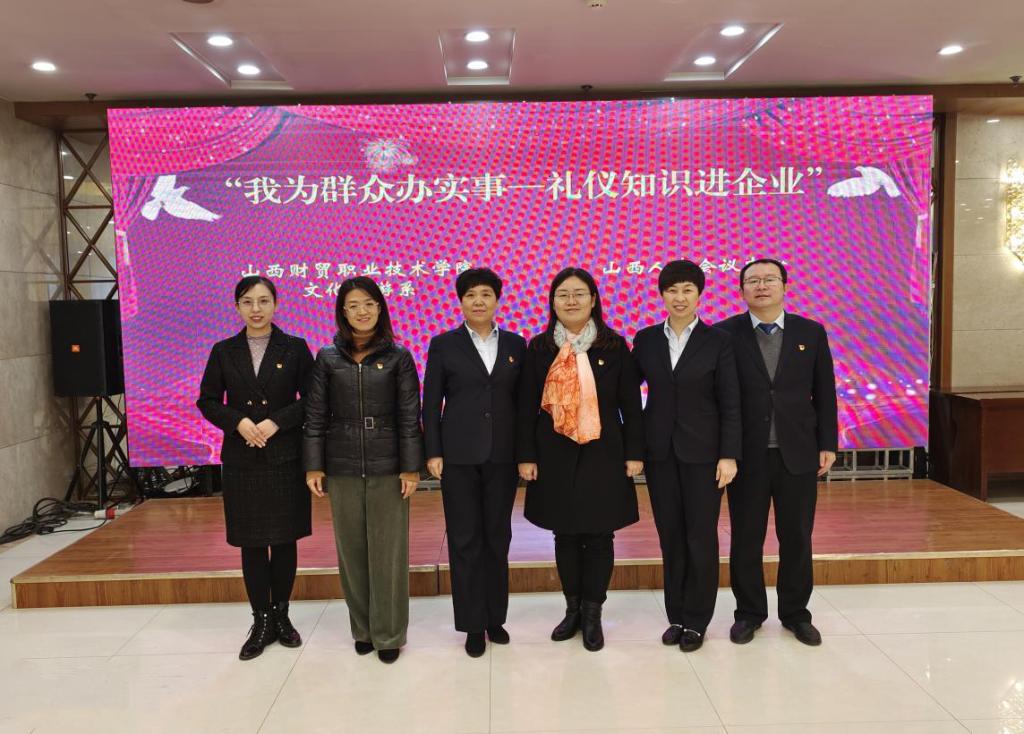 为了深化党史学习教育成效,学史力行,扎实推进“我为群众办实事”实践活动落深落实,普及文明礼仪知识,提升文明礼仪意识,助力地方企业发展,2021年11月22日上午,山西财贸职业技术学院文化旅游系与山西人大会议中心共同组织开展“我为群众办实事—礼仪知识进企业”的培训活动。文化旅游系党总支书记马娟、系主任王雪娟,山西人大会议中心主任冯萍出席本次活动。
