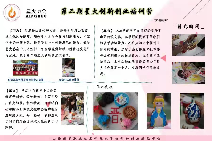10月26日,星火双创训练营召开以“以文会友,创意未来”为主题的文创活动,本次活动围绕山西非物质文化遗产进行文创形象设计,旨在通过书签、麻布包、素胚、彩泥等文创产品的设计与制作,加深学生对文创产业的认识并坚定文化自信,引导推动山西旅游文创产品的创新开发与设计。活动中同学们的文创作品富于创新、设计独特,将心目中的山西传统文化以全新的视角展现出来。本次活动共设计并制作60件文创作品,产生三支优秀创意设计学生团队,从美育入手提升学生的创新能力。