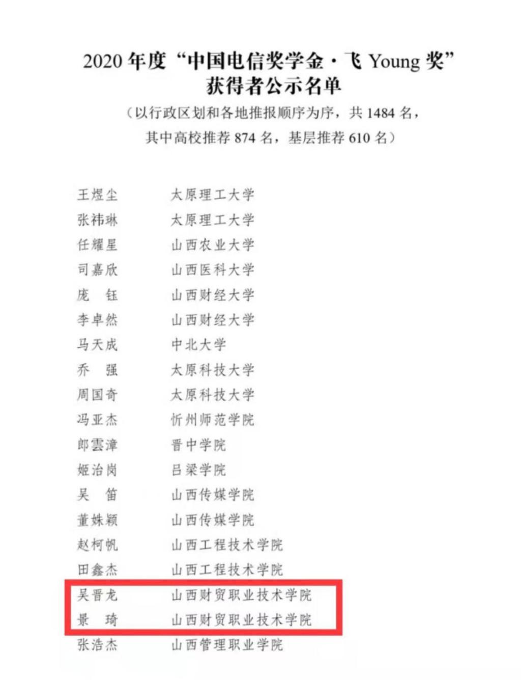 经学生本人申报、系团委遴选、院团委审核推荐、省级初评和全国评审等环节,我院经济贸易系营销1901班吴晋龙、物联网技术系计应2001班景琦两位同学荣获2020年度“中国电信奖学金•飞Young奖”。
