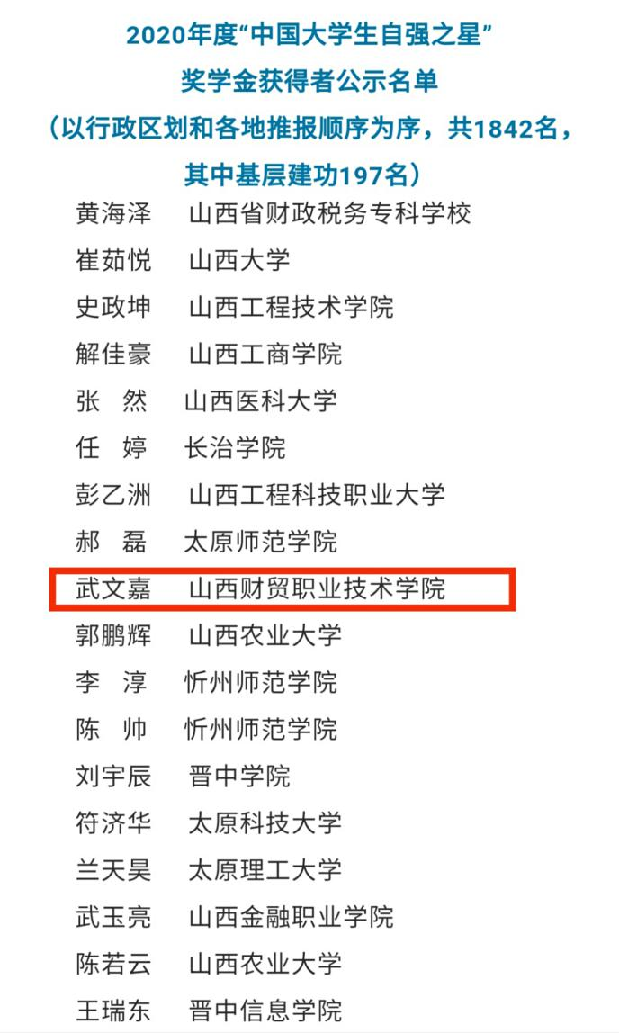 近日,由共青团中央、全国学联指导,中国青年报社、新东方教育科技集团联合开展的2020年度“中国大学生自强之星”奖学金获得者名单揭晓。经学生本人申报、系团委遴选、院团委审核推荐、省级初评和全国评审等环节,我院会计系会计1906班武文嘉同学荣获2020年度“中国大学生自强之星”称号。