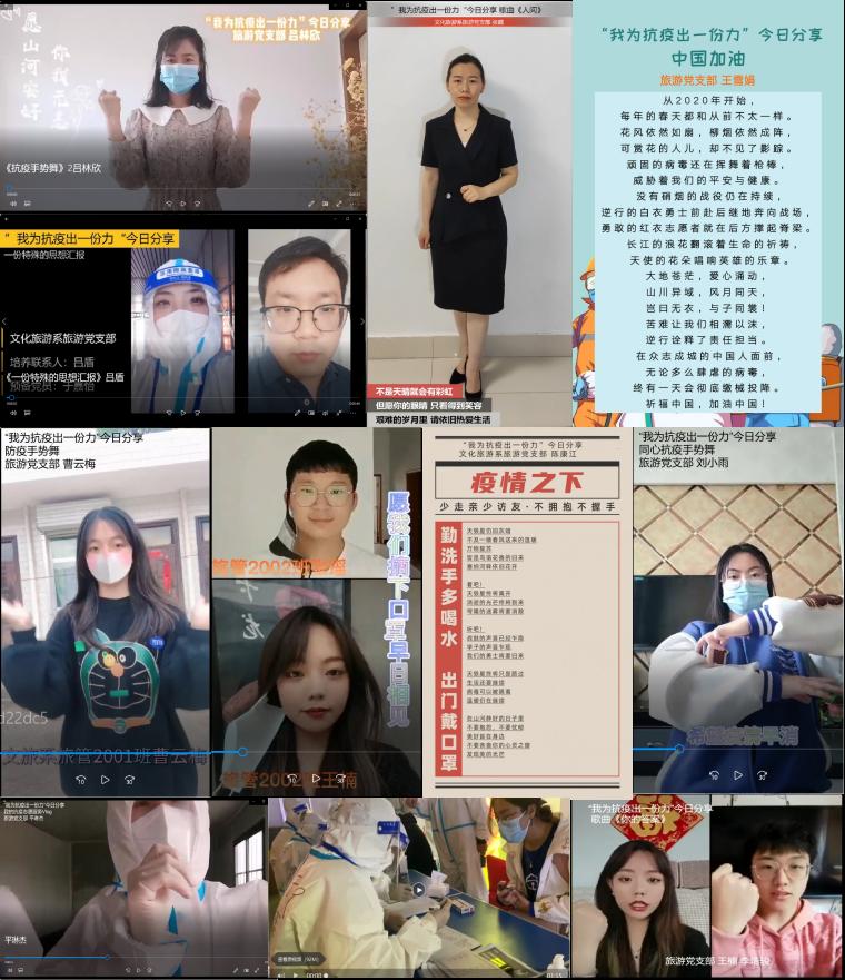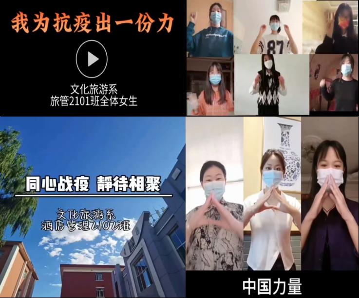 在党组织的带动下,各团支部也积极行动起来,拍摄抗击疫情宣传短片传递正能量。文化旅游系抗击疫情宣传工作正在全系范围内如火如荼地开展,广大师生投身抗击疫情一线的热情高涨。