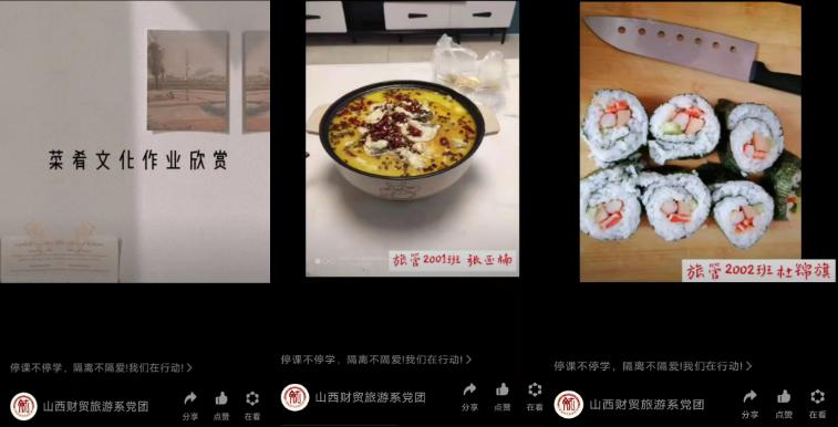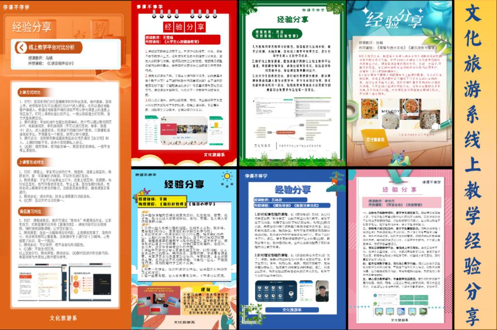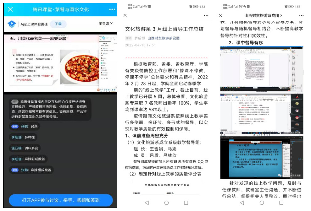 三是组织教学经验分享提高信息技术手段。为了进一步拓宽老师们线上教学的思路,增进教学经验交流,文化旅游系专题开展了“线上教学经验分享”活动,每一位老师都积极参与,纷纷把自己的“锦囊妙计”拿出来与大家分享。例如马娟老师从上课方式、课堂互动、课后复习三方面系统分析了钉钉课堂、腾讯会议、腾讯课堂的利弊,帮助大家选择适合自己的直播平台。王枫老师从课前、课中、课后分别运用不同的教学资源和手段,特别重视学生的互动交流。吕盾老师强化信息手段运用,每节课都准备两种以上线上教学平台,重视课程思政的融入。吕林欣老师结合课程特点,充分利用数字景区资源进行虚拟仿真教学,让学生们足不出户也能身临其境,顺利掌握知识点。张鹤老师在《菜肴与酒水文化》课程中,利用学生居家便利,布置菜品制作任务,让学生将所学知识运用到烹饪过程中,录制成小视频进行分享交流,让学生在学中做、在做中学。王雪娟老师灵活运用“云课堂”平台的“调查问卷”工具,在课前通过问卷掌握学生学情,课中运用问卷方式分析学生心理感受及时调整内容侧重点,课后采用问卷调查了解学生学习效果,作为改进教学方法的依据。李宋丹老师课上与同学们“共记笔记”,帮助学生梳理知识点;结合导游资格证考试内容,将知识要点编成电子口令,帮助学生加深记忆,强化知识。