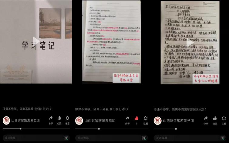 五是开展优秀学习笔记展示活动激励学生学习。为了配合本系教学管理工作,系团委一方面组织辅导员召开主题班会,积极教育引导学生以严肃认真的态度对待线上学习,另一方面开展优秀学习笔记评选与展示活动,利用微信公众号、视频号、抖音等学生喜闻乐见的宣传平台,将优秀案例集中进行展示,在学生群体中树立学习榜样,极大地激发了同学们的学习热情。下一步,将开展学习标兵评选活动,制定评选标准,通过线上教学平台数据、任课教师评选、学生互评等方式选拔出学习态度端正、学习效果良好的同学,激励同学们向学习标兵看齐,高质量线上学习。