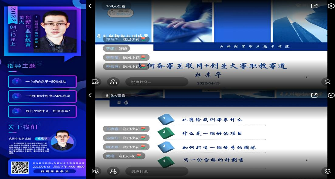 4月13日星火创新创业训练营通过第八届“互联网+”大学生创新创业备赛为主题的线上讲座正式拉开帷幕。杜建华老师从比赛介绍、选择项目、团队组建到撰写计划书由浅及深向线上所有学生讲解破解比赛重难点的方法。杜老师用真实的学生参赛经历及创业案例激发了与会学生们的创业热情,用切身的从教经验指导学生找到了释放创业潜能的途径。本次线上讲座累计840人次参与,为双创竞赛备赛起到了良好的推动作用,营造了浓厚的双创氛围。