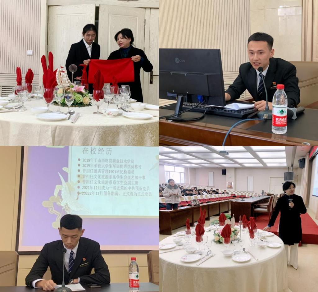 旅管0601班、现山西友谊国际旅行社计调部经理李文燕,旅管1701班、现临汾电子技术学校旅游管理专业教师申艺彤;酒管1901班、现并州饭店餐饮部预订主管、工会委员张一鸣,酒管1901班、现并州饭店餐饮部并萃阁领班陈富贵,结合自身工作经历与同学们进行了交流分享,凸显出专业技能和职业教育在当今就业形势下的重要性;荣获山西省第十七届“华住杯”高职组酒店服务赛项三等奖、酒管2202班的李林欣同学进行了中餐摆台展示。随后,酒店服务技能大赛专家,同时也是文旅系客座教授王文英老师结合比赛规则做了精彩的点评,强调了“细节决定成败”的重要性,鼓励同学们以赛促学强本领,以学促用展风采,以用促行践初心。