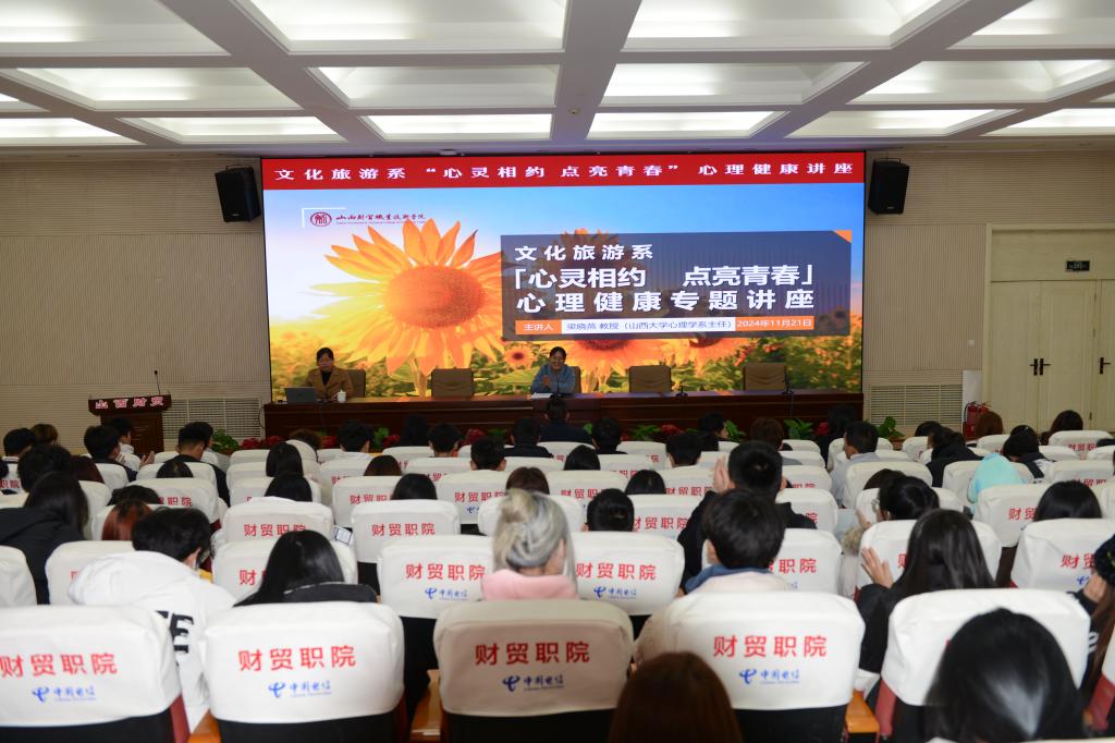 11月21日,文化旅游系邀请山西大学教育科学学院心理学系主任梁晓燕教授,在学院大报告厅为师生带来了一场主题为“心灵相约 点亮青春”的心理健康教育专题讲座。此次活动旨在提升学生心理健康意识,引导学生正确面对大学生活中的挑战,促进学生全面发展。文化旅游系全体辅导员、2024级新生和学生干部参加讲座。