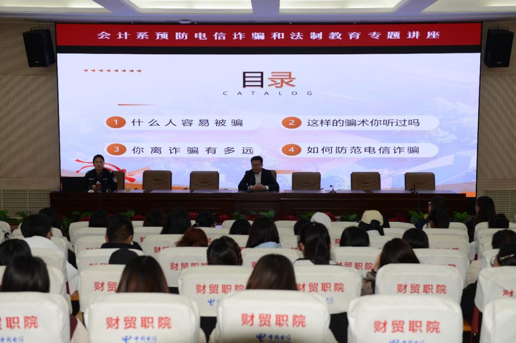 近年来,越来越多的电信网络诈骗将目标人群瞄准在校大学生,电信网络诈骗、网贷(校园贷)等多种形式的诈骗案件在高校中时有发生。为进一步提高学生的网络电信诈骗识别和防范能力,维护同学们的切身利益,预防各类网络电信诈骗事件,营造和谐平安的校园环境。11月14日下午,会计系联合太原市公安局小店区黄陵派出所在砺志楼大报告厅内举办了会计系“安全知识大讲堂”——预防电信诈骗和法治专题讲座。黄陵派出所副所长李静担任主讲嘉宾,会计系副主任郝小磊主持此次专题讲座。