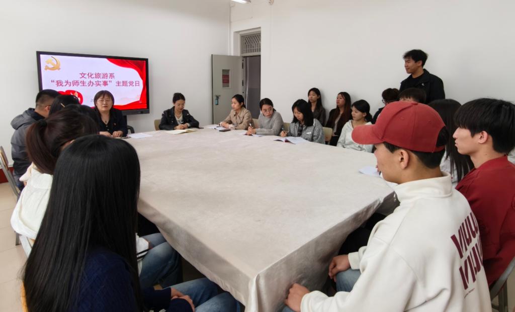为深入贯彻落实党的群众路线,进一步发挥基层党组织战斗堡垒作用和党员先锋模范作用,切实解决师生在学习、工作和生活中遇到的实际问题,2025年5月7日,文化旅游系党总支以座谈会的方式在党建活动室组织开展了“我为师生办实事”主题党日活动。系党员干部、支部书记、组织员和30余名学生代表参加会议。