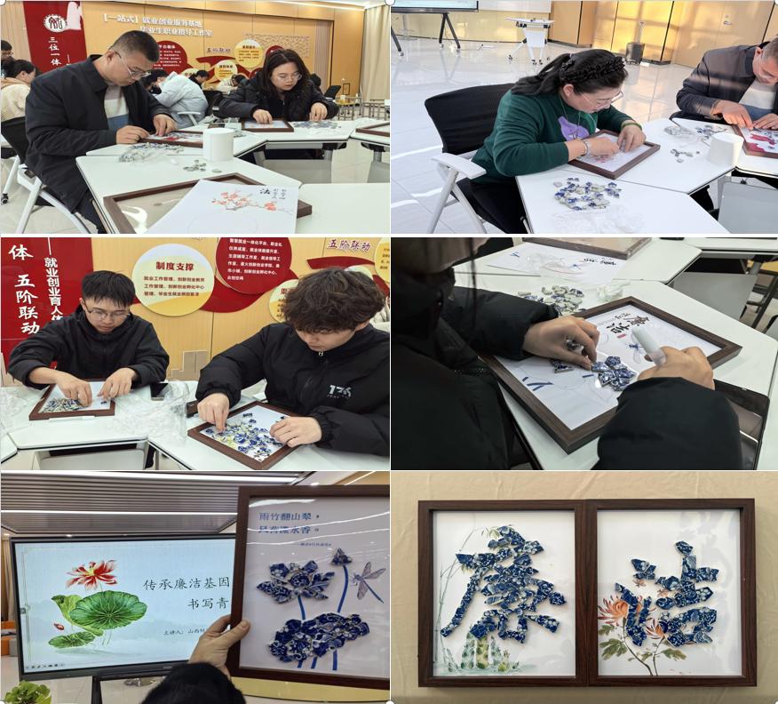 授课结束后,组织教师、创新社区学生开展廉洁主题瓷片画制作活动。青花瓷“清白素雅”的文化寓意,荷花“出淤泥而不染”的廉洁象征,赋予了本次活动更加深刻的文化意蕴。大家对照清廉若水、松风傲骨等主题图案精心拼接,每一片瓷片都精准对位,就像我们做人要坚守底线,不能有丝毫偏差。通过老师、同学们的精心制作,原本零散的瓷片逐渐汇聚成一幅幅廉洁作品,苍劲的青松、清丽的荷花在指尖绽放,将廉洁理念转化为可视可感的艺术表达。