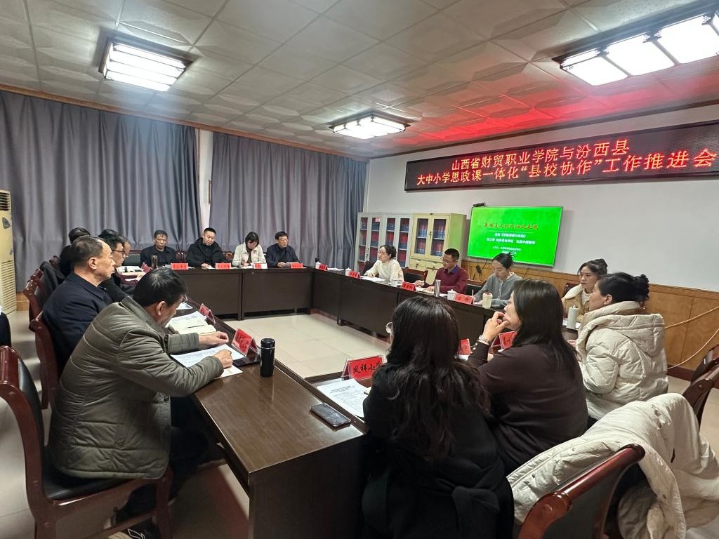 为进一步贯彻落实山西省教育厅《关于建立大中小学思政课一体化“县校协作”机制的通知》文件精神,着力推动各学段思政课的系统性衔接、整体性贯通与深层次融合,12月10日,山西财贸职业技术学院思政部主任滑登红带队一行5人赴汾西县教育体育局,召开大中小学思政课一体化“县校协作”工作推进会。会议由汾西县教育体育局党组书记、局长郭瑞华主持,各学段学校负责人及思政课教师代表共21人参加会议。