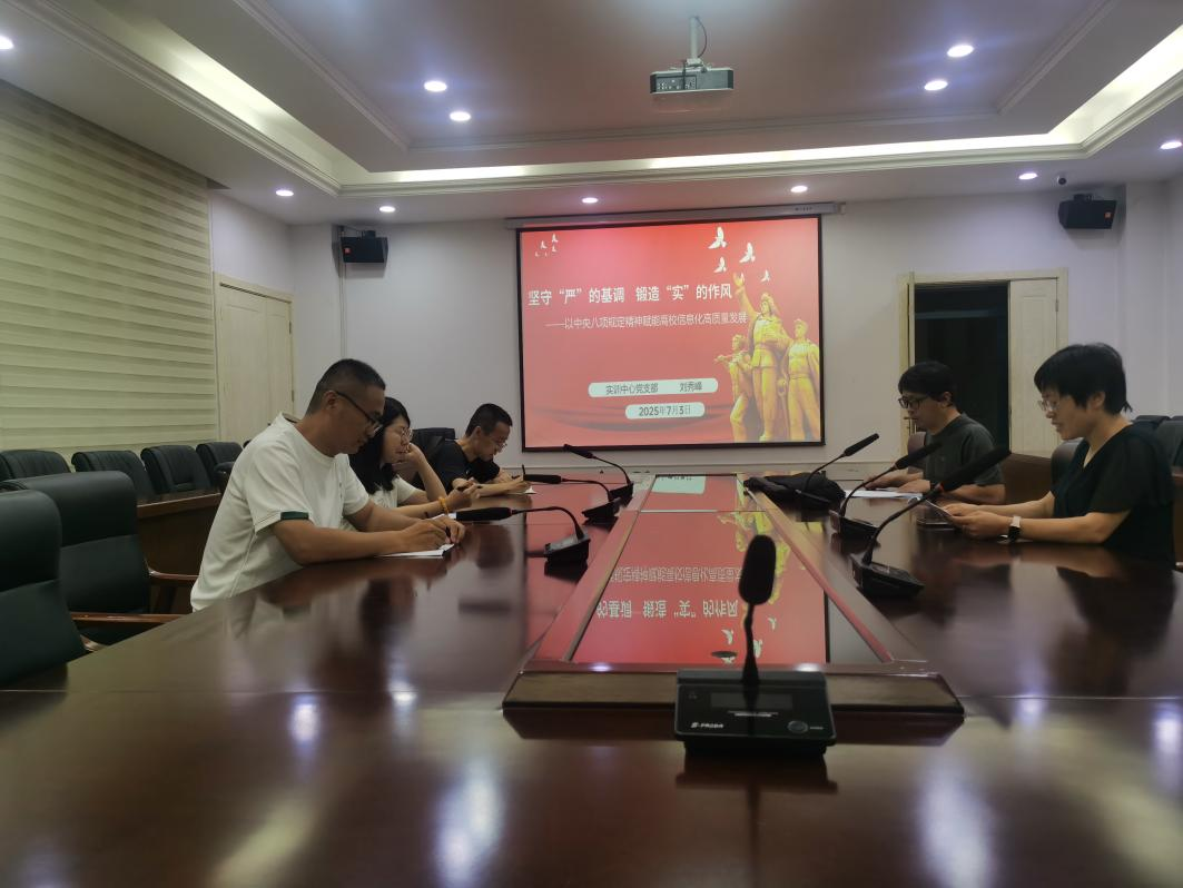 2025年7月3日上午,实训中心党支部在砺志楼小报告厅成功举办了以“中央八项规定”为主题的专题学习活动。支部书记刘秀峰以“坚守‘严’的基调,锻造‘实’的作风——以中央八项规定精神推动高校信息化高质量发展”为题,为全体党员讲授了一堂生动的党课。